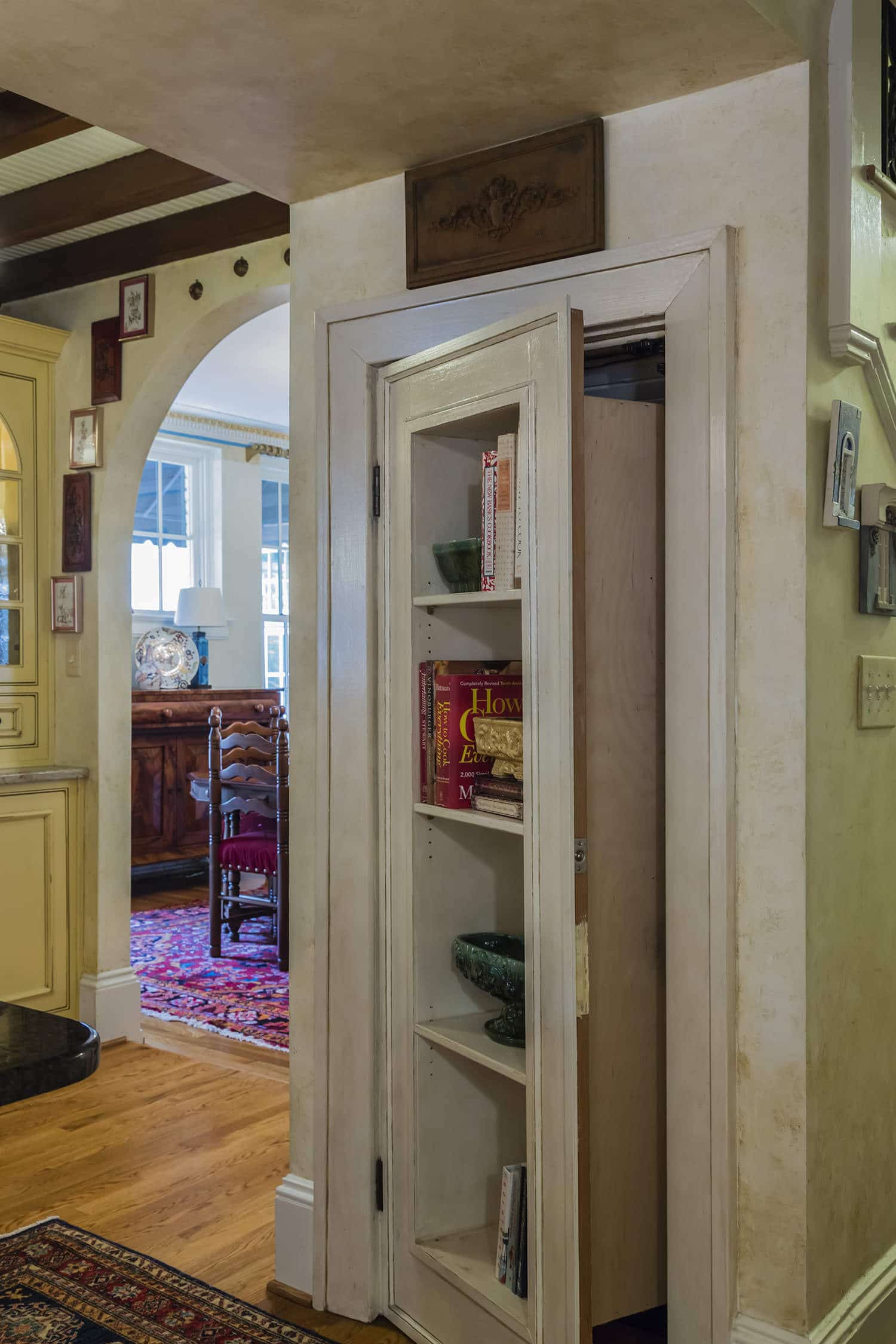 In the kitchen, a bookcase door to the basement solved an interior wall issue while creating a focal point and storage for cookbooks.