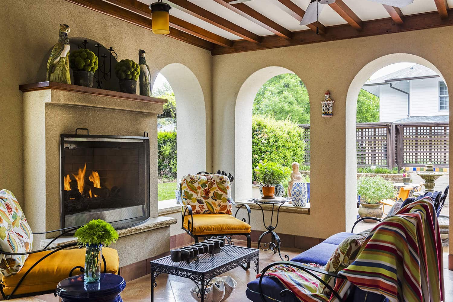 A loggia with thick stucco walls and a fireplace provides a four-season room. Arches mimic those inside the home and are typical of the Spanish Colonial style.