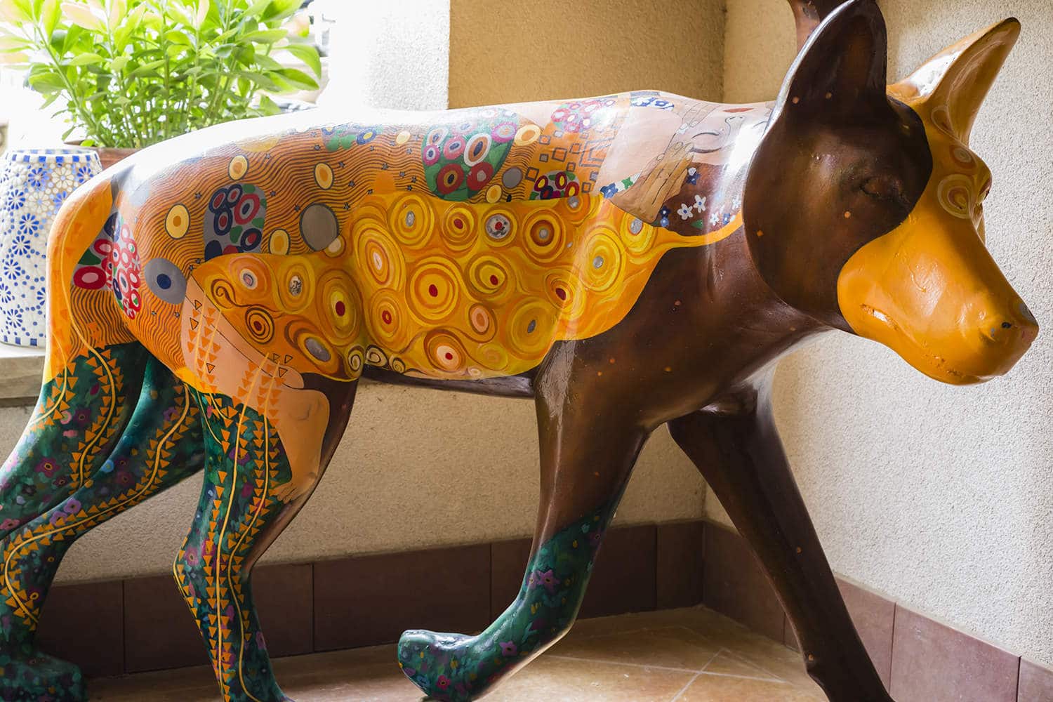 A wolf from the Red Wolf Ramble (a public arts project Marcotte helped launch during her time on the City of Raleigh Arts Commission) occupies a corner of the loggia. The wolf’s design was inspired by Gustav Klimt’s The Kiss.