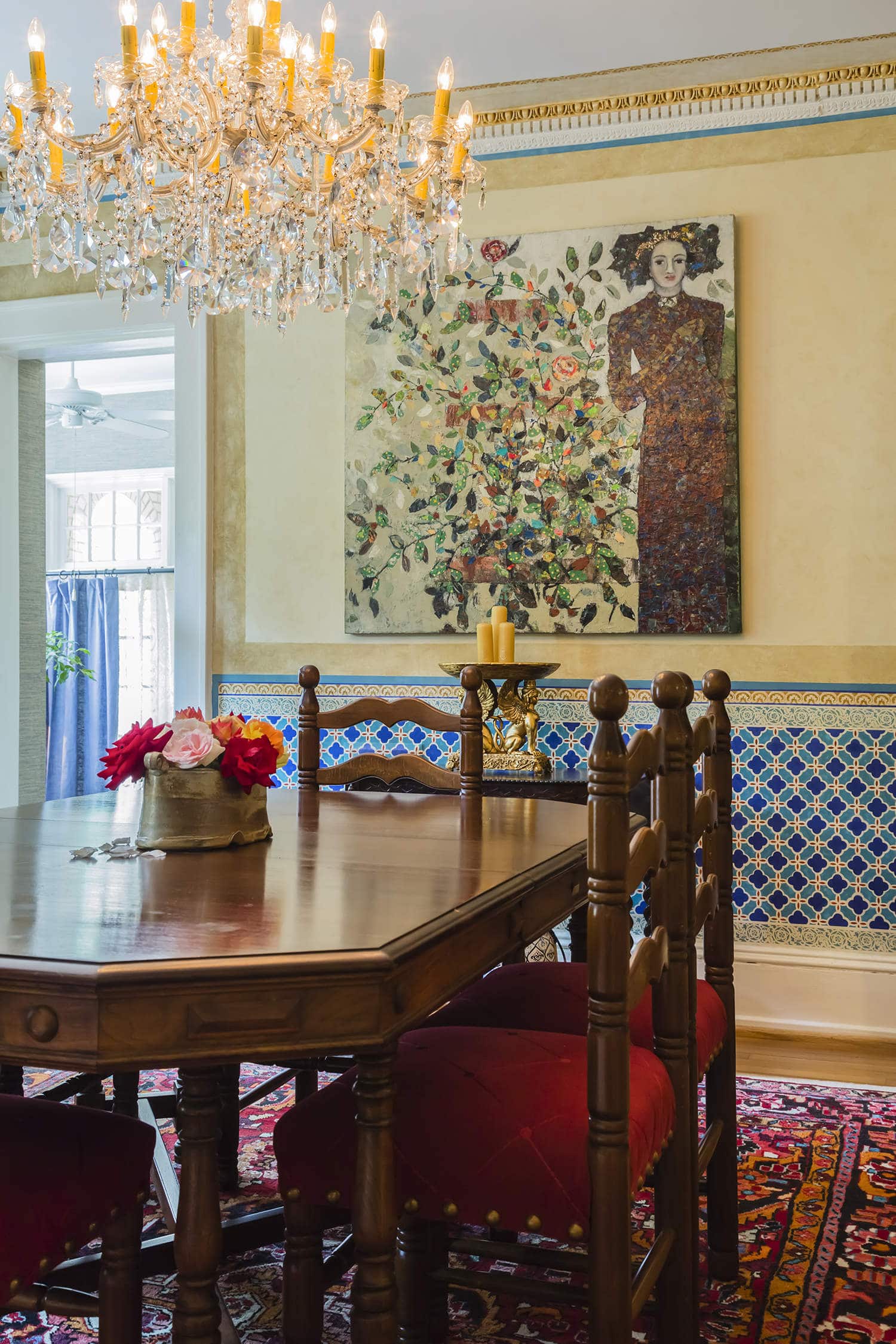 In the dining room, a yard-sale-purchased table is at home between walls painted to resemble Moroccan tiles. The painting is by Croatian-born, California-based artist Zivana Gojanovic.