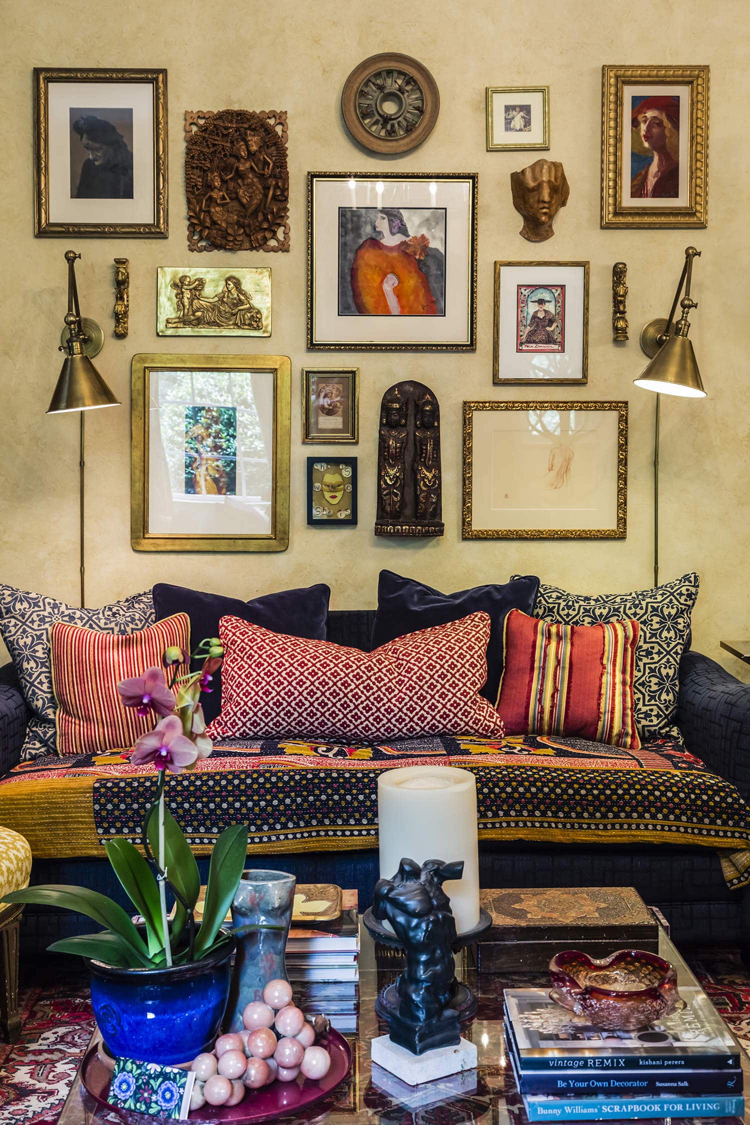 In the living room, a collection of figural art is displayed above layers of patterned textiles. Works include Raleigh artists Madonna Phillips, Mike Rigsbee and Jan Edwards (deceased), and Pennsylvania-based artist Robert Patierno. Marcotte frequently employs art groupings in her interiors and likes to incorporate three-dimensional art as well. For clients, she does her own installations. She enjoys the precision and planning involved in puzzling out placement, and says she’s quite skilled with a drill and hammer.