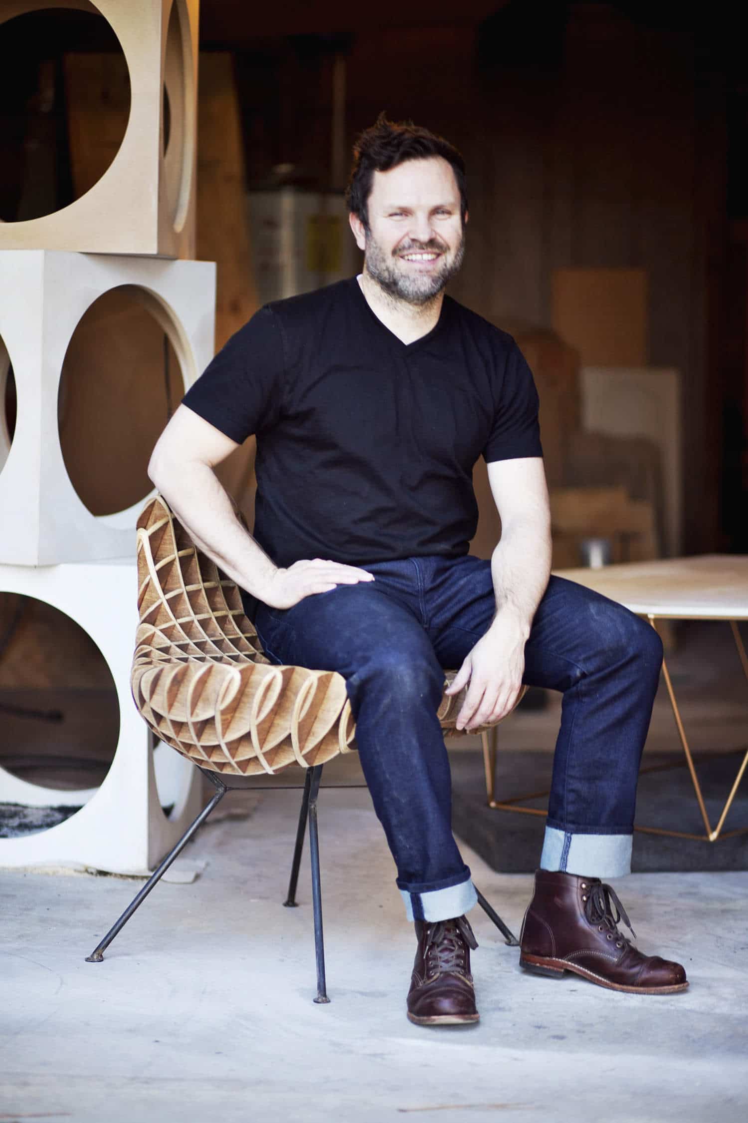 Ryan Dart sits on his Bantam chair, which takes its design cues from his Quarry bench. In the background, stacked at left, are unfinished Compass tables.