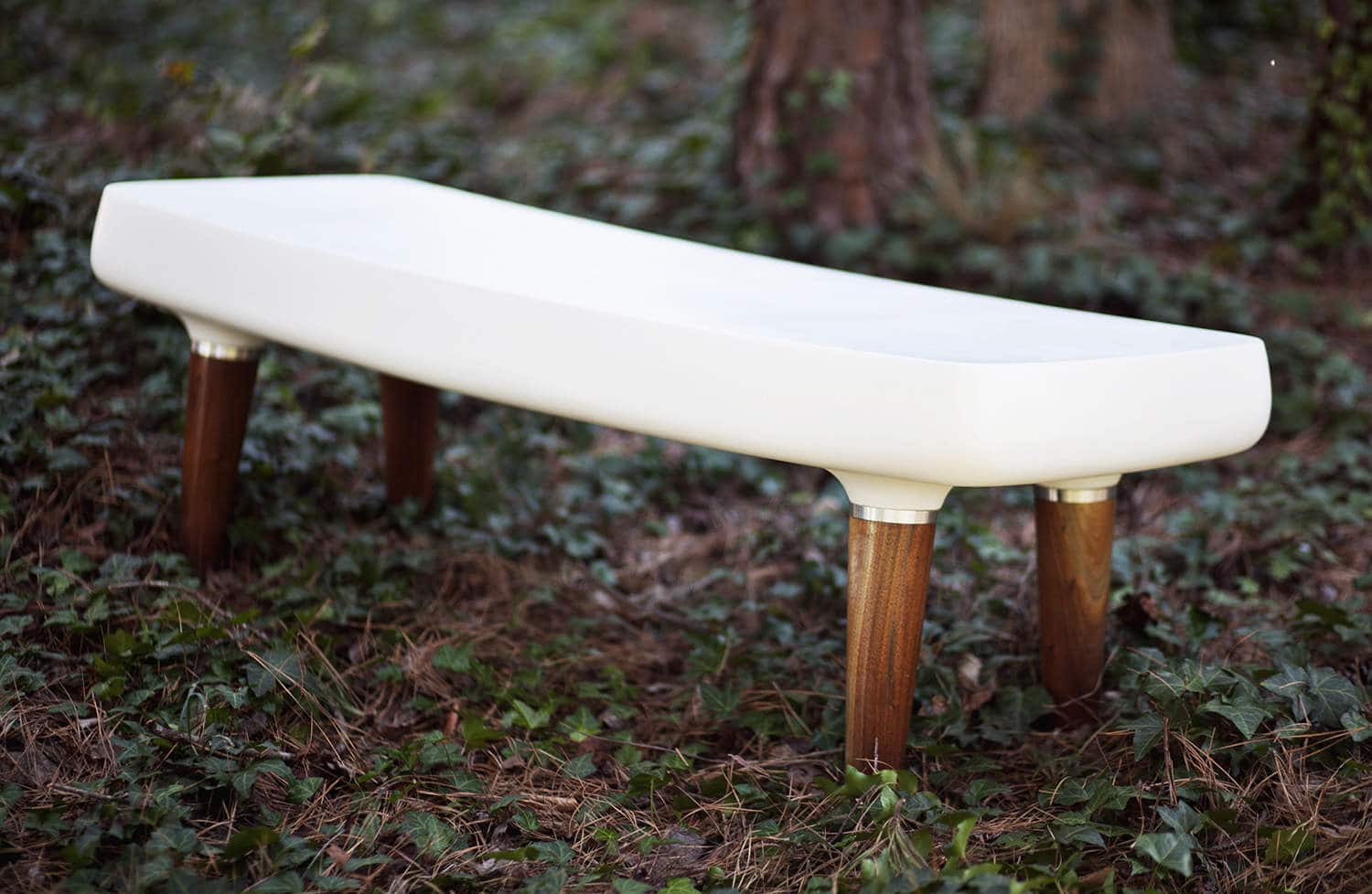 The Jersey bench is named for the sloped back of a Jersey cow. It has a fiberglass seat and sleek, tapered walnut legs with brass fittings.