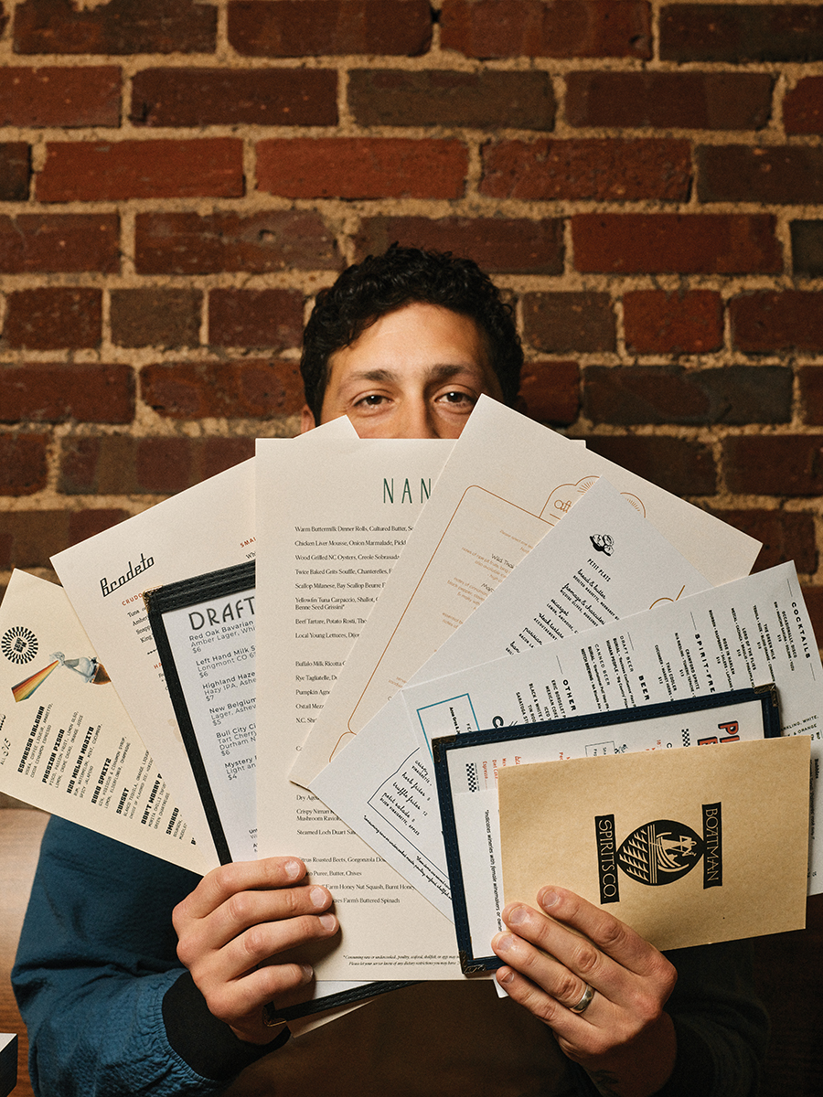 Once the primary identity is established, he develops all of the other visuals, including menus, signage, interior touches like artwork or wayfinding, merchandise, promo pieces and art direction for digital assets like the website and social media.