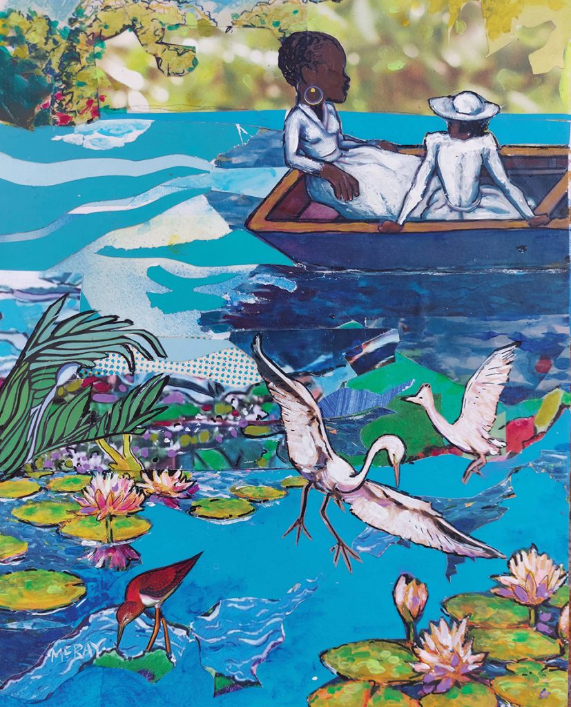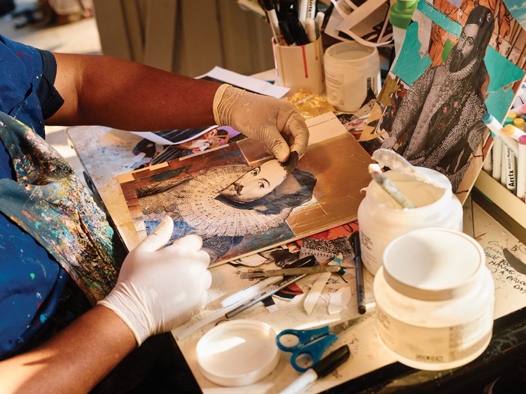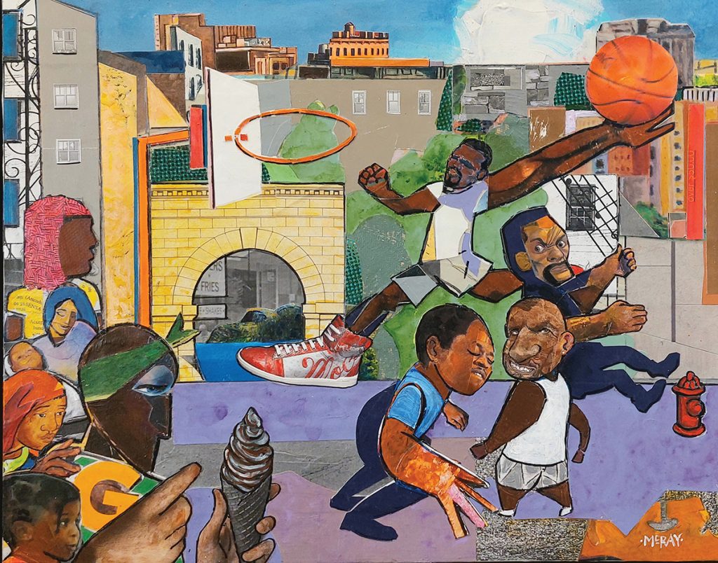 Today, he works from his home studio, where he’s currently working on a series of collages in a visual style reminiscent of one of the most influential African-American collage artists, Romare Bearden. A piece titled Boomtown at Night shows a collaged cityscape of an imagined metropolis in the background; interior, everyday moments in the foreground include a trumpet player being watched by a collaged couple and other people walking the streets.