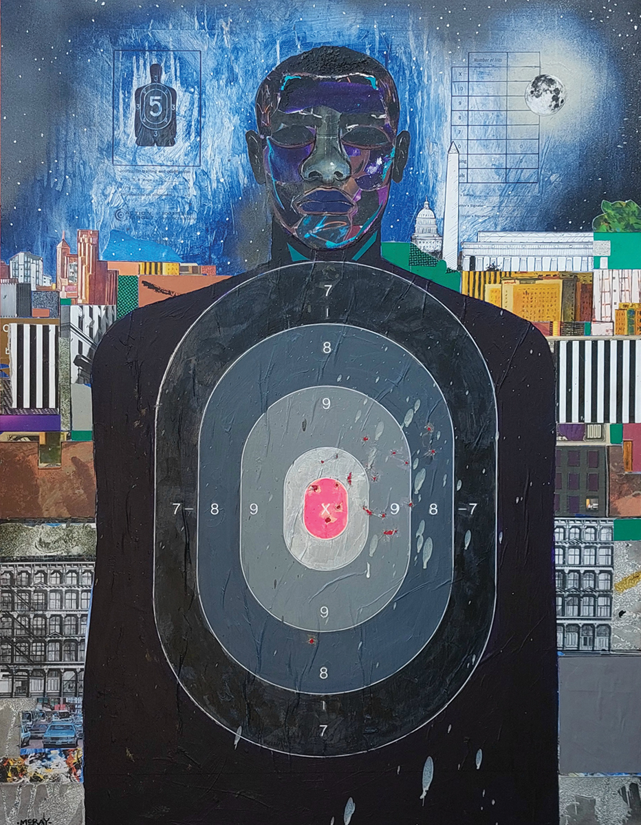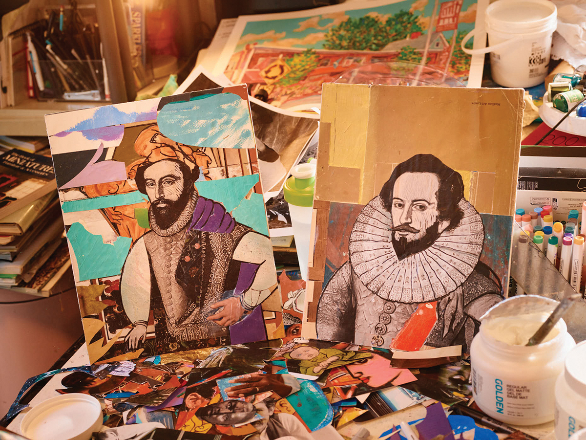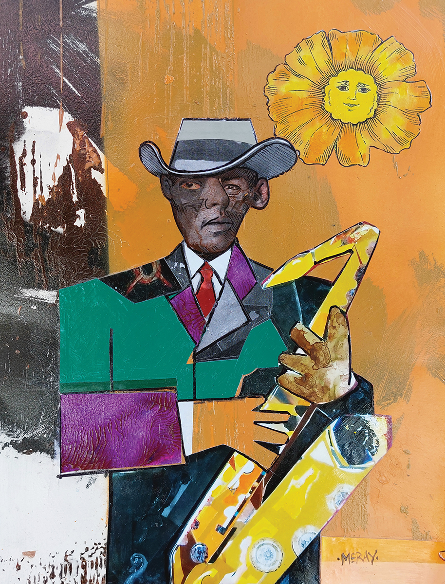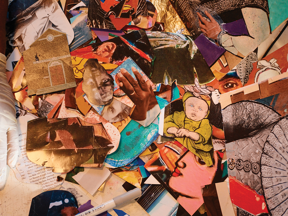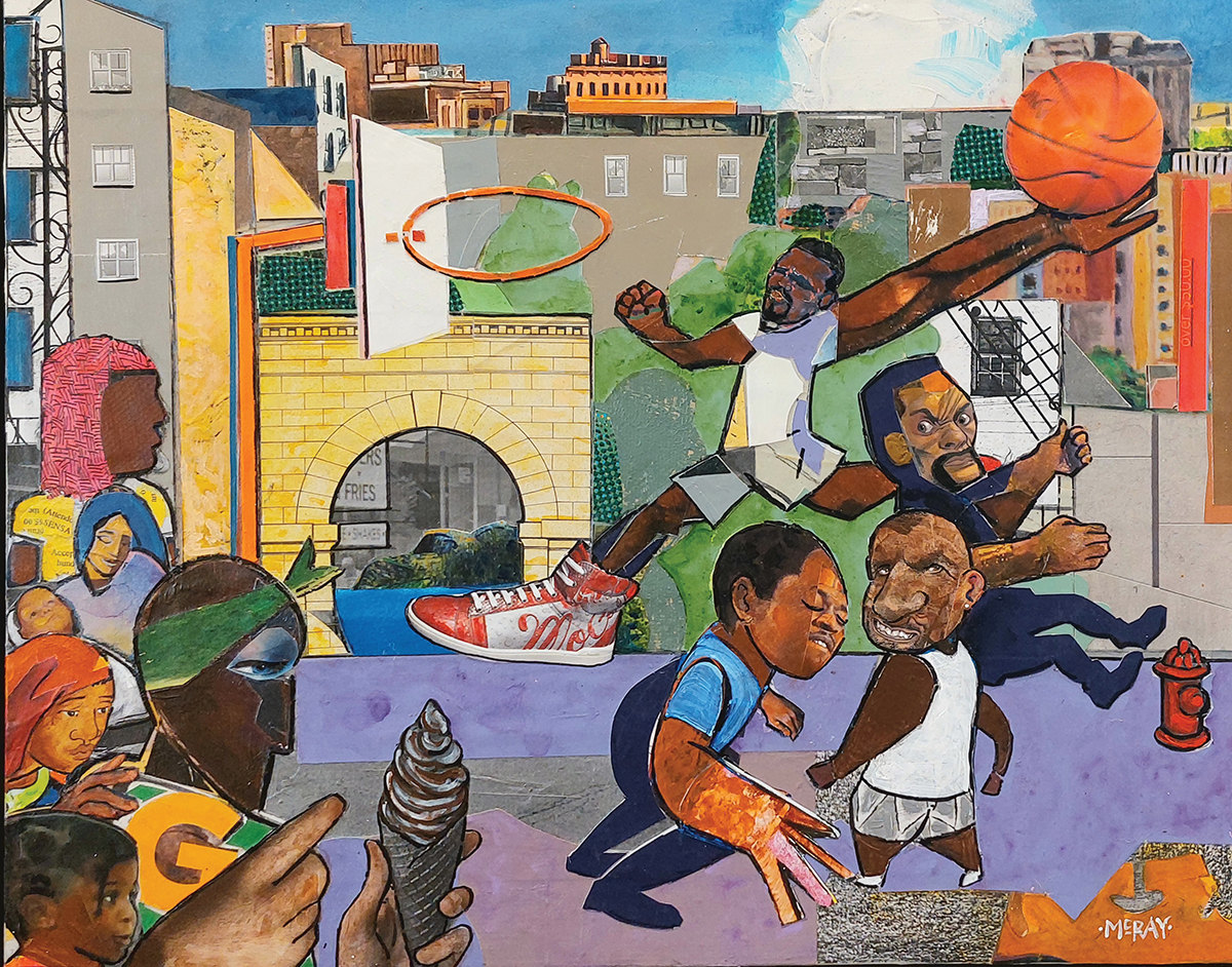 Today, he works from his home studio, where he’s currently working on a series of collages in a visual style reminiscent of one of the most influential African-American collage artists, Romare Bearden. A piece titled Boomtown at Night shows a collaged cityscape of an imagined metropolis in the background; interior, everyday moments in the foreground include a trumpet player being watched by a collaged couple and other people walking the streets.