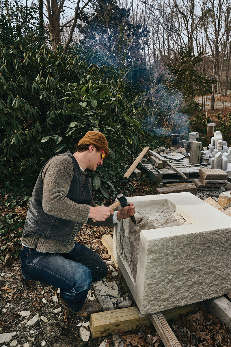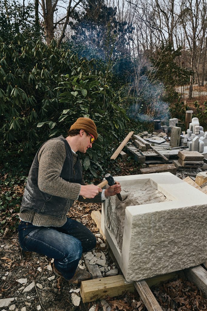 Byrd, who’s been a stone mason for more than a decade, grew up in the trades; his father owns Byrd Tile Distributors, so in addition to being close to the material, he also studied the techniques of artisans within his family’s orbit. One of those people was Brooks Burleson, the mason behind the undulating stone walkways, retaining walls, arches and bridges at the Duke Gardens. “I met Brooks when I was 5, and when I turned 19, my mom said, Brooks has been waiting, are you ready to work?,” Byrd says. “At that point I was ready.” Byrd apprenticed with Burleson from 2011 to 2014, also studying at the Penland School of Craft and the John C. Campbell Folk School to pick up skills in metalsmithing and woodworking along the way. He didn’t love school, but he did love working under Burleson.