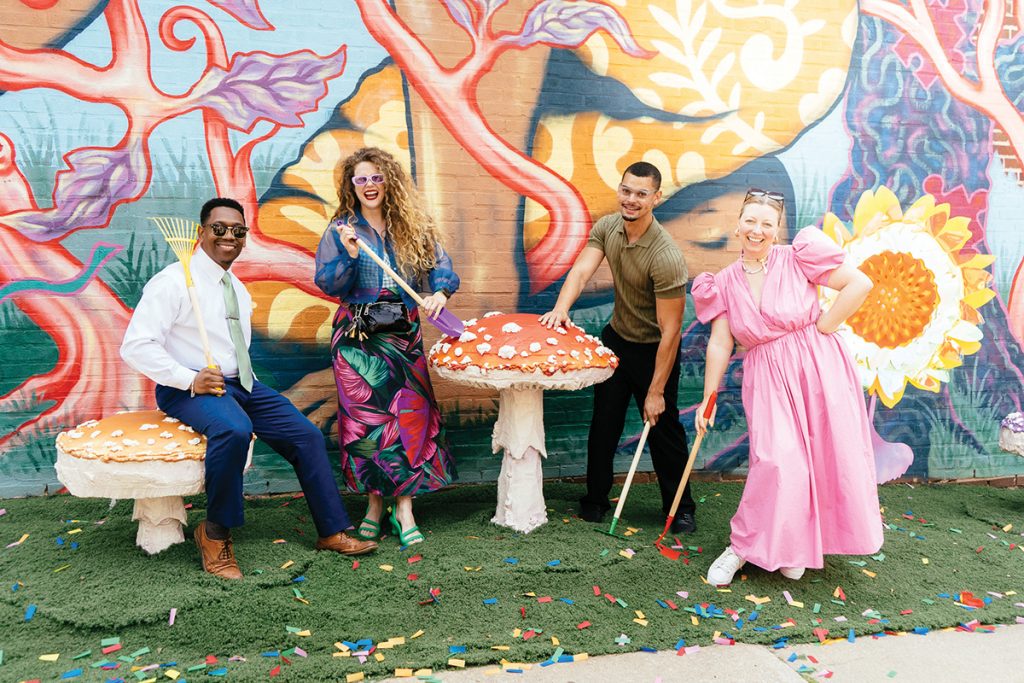 In 2023, Stewart was approached by Artsplosure program director Cameron Laws to create Raleigh’s Smallest Park on the corner of Hillsborough and West Streets. Located in front of a mural titled Parks for the People by artist Gabe Eng-Goetz, the streetside installation uses reclaimed synthetic turf and a collection of whimsical red toadstool mushrooms, floral pinwheels and colorfully painted benches to create a fantastical pocket park.