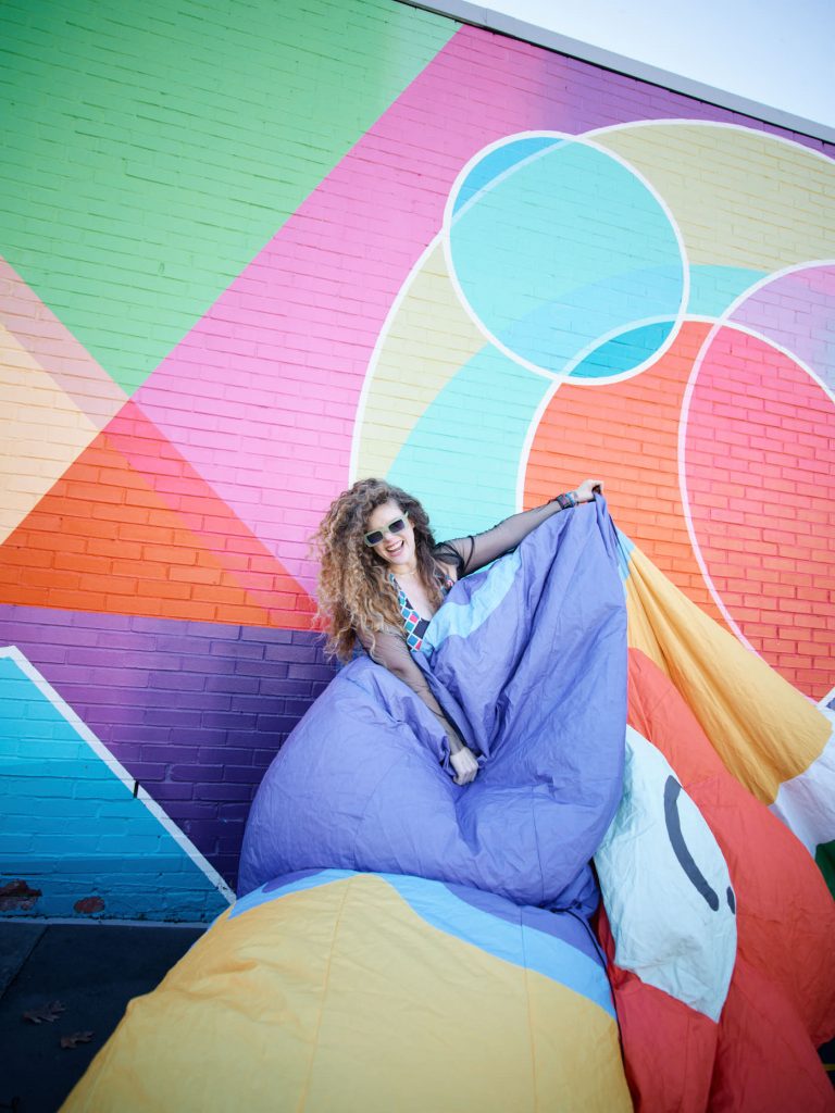 Since then, she’s continued to experiment with inflatables, modeling various surface design techniques for the fabrics she used, while maintaining meticulous records around the installation logistics — from tethering to sandbagging to voltage requirements — for each piece. “There’s an incredible, beautiful, shiny, lovely aspirational product that happens with installational design, but it is also arduous — heavy schlepping,” she notes. “I joke that at the end of each install I have ‘installation legs’ or ‘festival legs’ because they are beaten, battered, bruised. I am a mess, but the product looks amazing.” She’s continued to scale her works both in size and marketability since discovering her knack for inflatables.