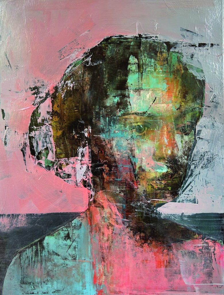 Known for paintings that feature finely nuanced portraiture through an abstracted lens, Sack often obstructs faces with shapes and colors, combining pencil drawings with watercolor and finally oil paint. Sometimes two or three portraits of the same person are layered on top of each other, revealing just enough detail to recognize who it is.