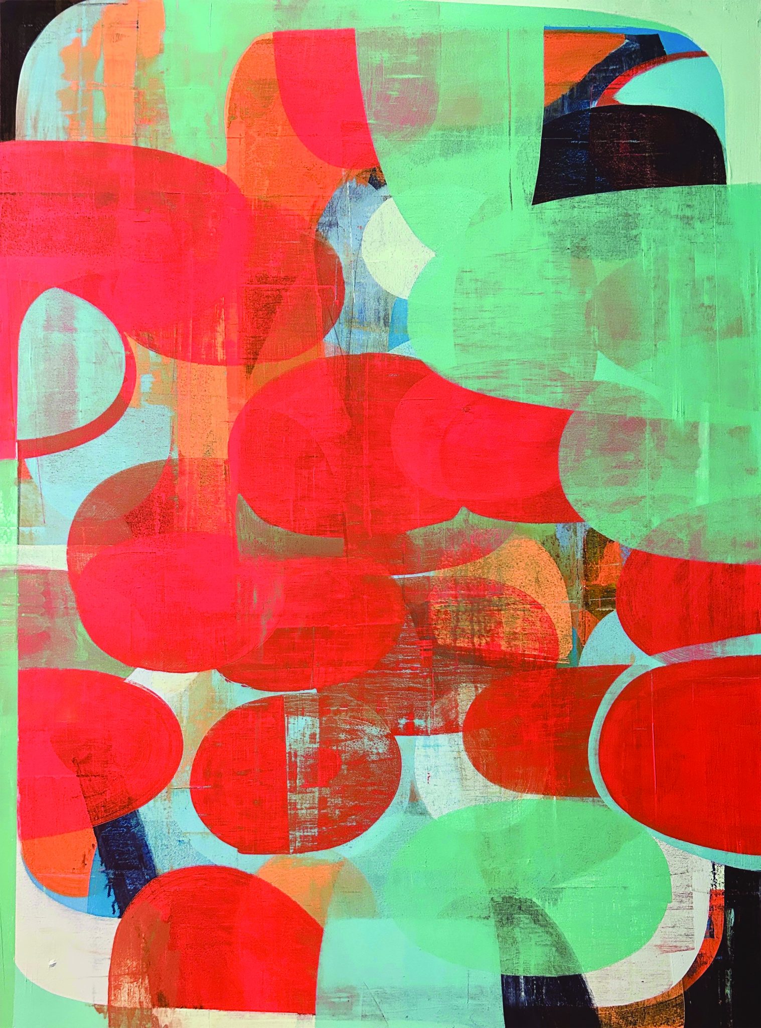 His completely abstract paintings are no less contemplative. One such series, Thought Patterns, “was created with the premise that we begin every day as a new person,” he says. Depicted as layers of spheres and ovals of various hue, some are cool and moody, others buoyant, a few bright and jangled. The resulting paintings reflect the moods and thoughts of the days he made them. “Each day we are reacting to fresh thoughts, actions and environments,” he says. With a limited palette and the self-imposed requirement that he complete each piece within a single day, the works are “fully representative of a particular moment in time, and take into account the deeply layered experience each individual has with the present moment.”