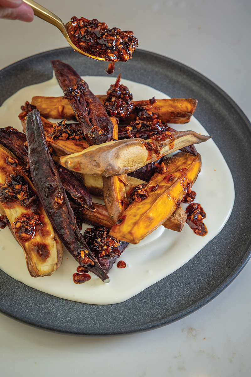 It comes as no surprise that Thanksgiving is Abernethy’s favorite holiday: it’s rooted in hospitality, brimming with connection and focused on the life-giving joy of good food and drink. But even so, Abernethy doesn’t believe in doing it all. “So often, people save their most intricate and difficult recipes for Thanksgiving, when there is already so much going on,” she says. “You don’t need to have your hands on every detail of your meal for it to be great and memorable.” That’s why alongside their family recipes, the couple will serve NC sweet potatoes from chef McFarland (made with a chili crisp infused with cranberry and aromatics), produce-forward side dishes from chef Fletcher and a showstopping pumpkin crumb cake from pastry chef Bonnie Cameron.