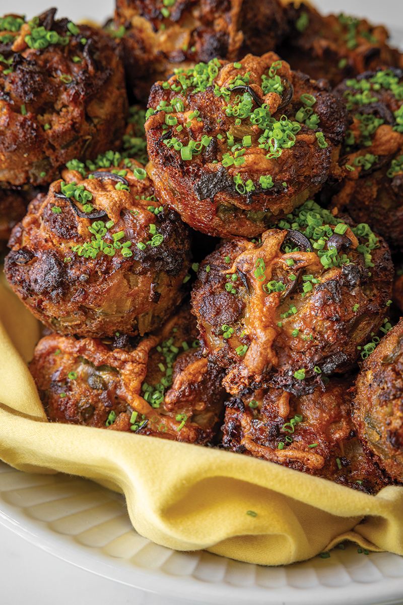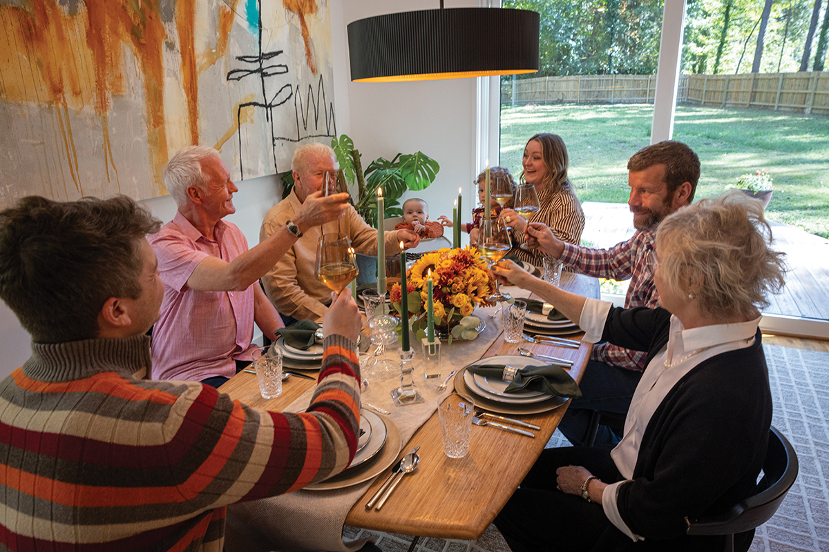 Every Thanksgiving, Abernethy and Borreson host a robust buffet; some years extra chairs are brought in, and some years it’s more intimate, but one thing that’s sacred is it always starts with bubbles. A self-proclaimed stemware addict, Abernethy believes champagne offers the right enchantment to kick off any celebration — preferably with a saber. As per tradition, someone in the family will sword off the top of a champagne bottle on the back deck. Corks are labeled with dates and kept as keepsakes. Abernethy often whips up three kinds of stuffing, including oyster stuffing from Borreson’s family, cornbread stuffing with sausage (hello, Southern roots) and the good stuff inside the turkey. There will be mushroom gravy from her aunt Betty’s recipe, and Borreson typically smokes a full salmon and roasts some oysters.