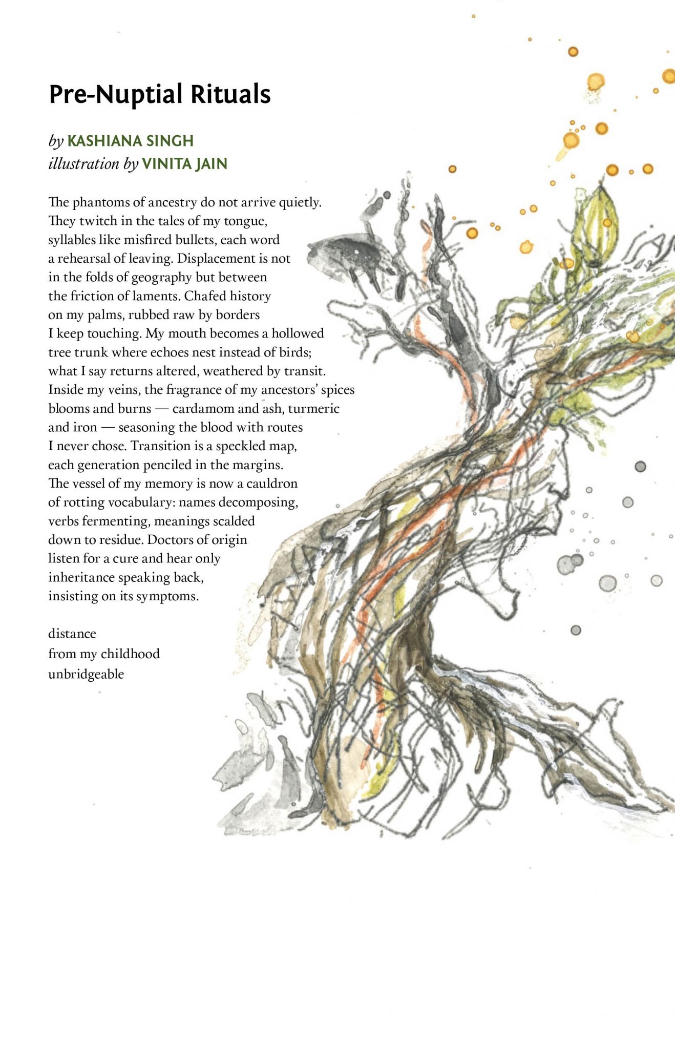 The author of five poetry collections, poet Kashiana Singh lives in North Carolina. Her latest collection, The Dualities of Albireo, was released in June 2025 with The Poetry Box. She proudly serves as managing editor for Poets Reading the News and is president of the North Carolina Poetry Society. “This poem emerges from the tension between inheritance and departure: how ancestry speaks through the body before language is ready, how ritual carries both blessing and rupture. It reflects on displacement not as a matter of land but of voice.”