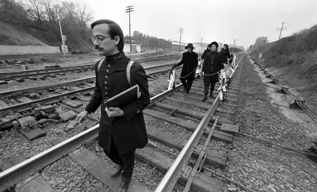 Our bridge traverses railroad tracks. We wanted to illustrate the relationship between the bridge and its function. Therefore, we began the performance with a procession down the tracks to the bridge. I led this procession ringing a hand bell followed by four women dressed in black. They dragged behind them towlines and streamers with railroad spikes attached. This made a wonderfully eerie and mournful clinking sound as we made our way to the bridge.