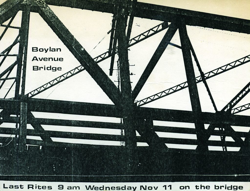 In 1978, the old Boylan Avenue bridge — an aging steel truss bridge that spanned the 150-foot railroad cut at the Boylan Wye — was permanently closed. An engineering assessment deemed the beloved structure unsafe, overloaded and deteriorating.