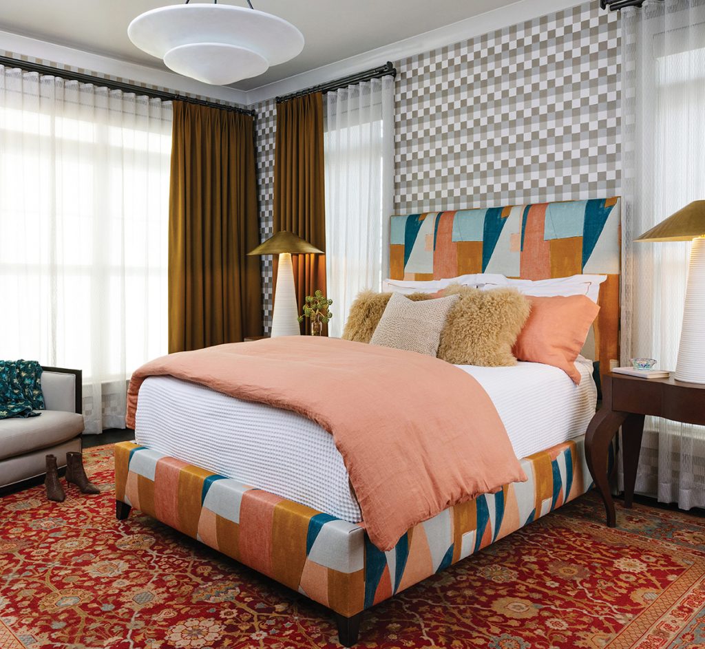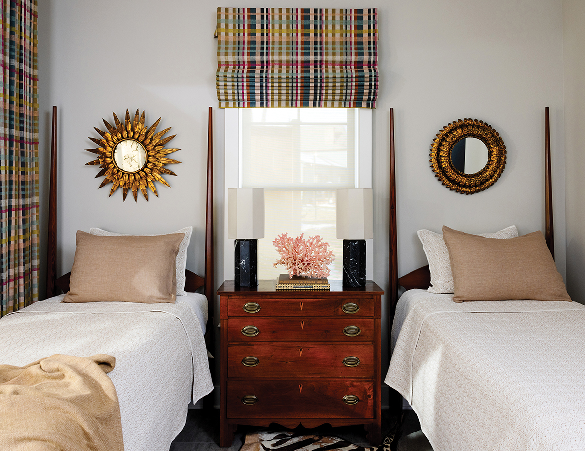 They used this formula throughout the home. In the bedroom, for example, they paired an antique rug with a bed in the same color scheme, custom-upholstered in a contemporary Kelly Wearstler for Lee Jofa fabric. Checkered wallpaper offers a contrast, and a Baker accent chair they already had was recovered to work for the space. In the guest room, the near-identical combos of beds, mirrors and ottomans are “sisters not twins,” says Pugh. “The symmetry is there, but it’s just a little off.” MacNeill chose plaid curtains to round out the space. “We wanted to jazz it up a little, make it more colorful and fun,” he says. “The stripes in the curtains feel cohesive with the zebra rug, but a little unexpected.”