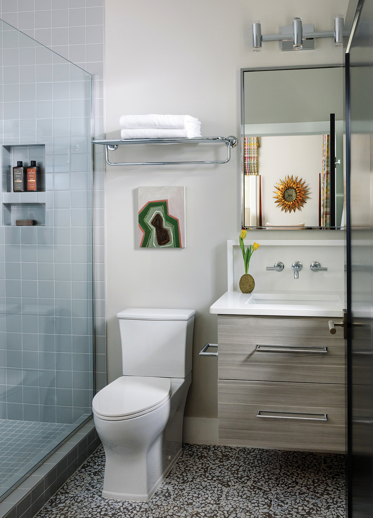 In the guest bathroom, commercial-grade tiles give an almost institutional look. “It’s the sort of tile you’d find in a YMCA shower,” laughs MacNeill. The art is by Raleigh-based painter Ashlynn Browning.