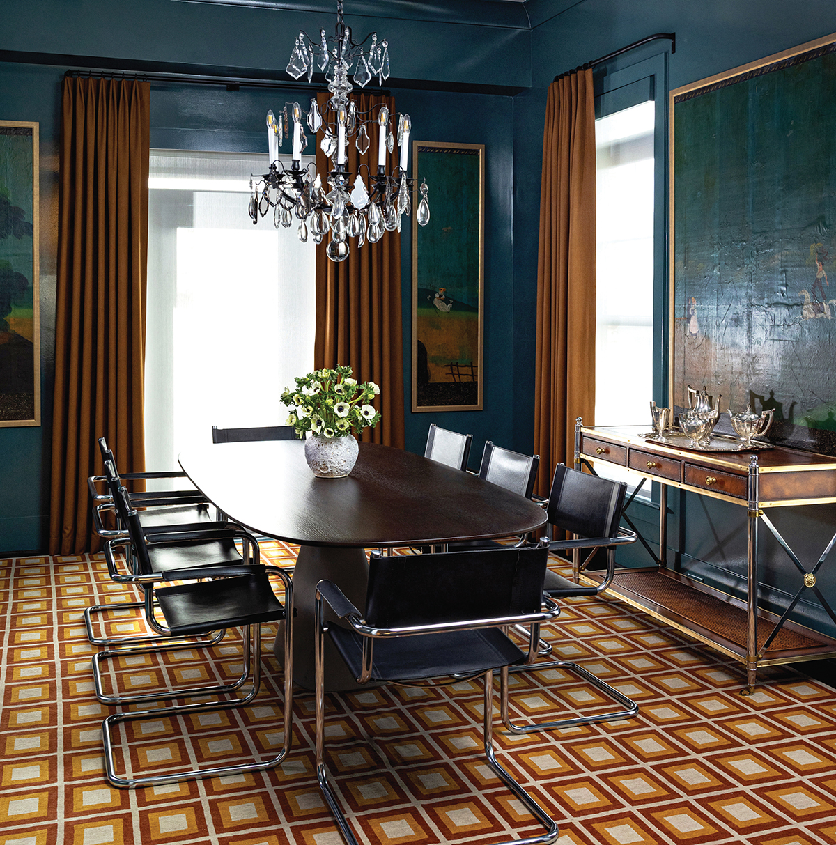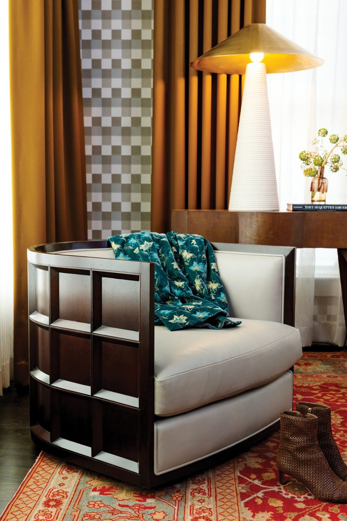 But beyond that, each space has its own feel. In the dining room, they took the “color drench” approach, says Pugh, painting the walls and molding Farrow & Ball’s Inchyra Blue. The homeowners already had the wallpaper panels and crystal chandelier; the Roux MacNeill team cleaned up and reframed the wallpaper, selecting pieces that would fit in the available wall space. “They create a sort of panorama,” says MacNeill. The sideboard is a new-to-them antique found at High Point, which MacNeill selected for its mixed metals (“I like how it combined the brass and chrome,” he says), but the dining table is actually a commercial conference table. “It has a concrete base and a nice modern curve to it,” says MacNeill. He worked with a custom rugmaker in Nepal on a check-print rug to tie it all together. “We changed the color a few times to get it just right,” he says.