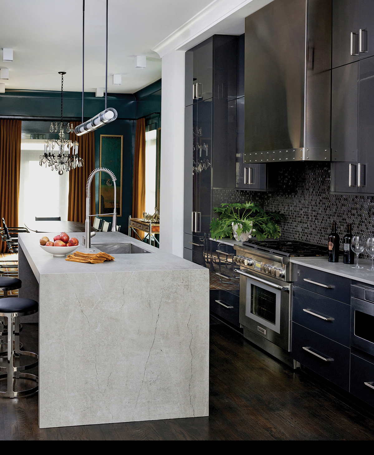 The open-plan dining room, kitchen and living areas presented a challenge. “We wanted to visually connect the spaces, but also have them feel different from each other,” MacNeill says. To unify them, they sprinkled chrome and high-shine accents throughout, including in the kitchen hardware and lighting as well as in the vintage chairs in both the living and dining areas. “We also bookended the rooms with color, it helps keep your eye traveling,” MacNeill says.