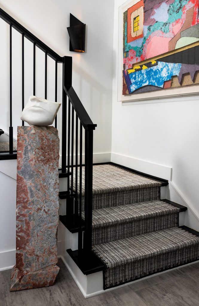 The homeowners, a couple whose children are grown with families of their own, moved to the Legacy Builders townhome from a much larger residence in Country Club Hills, attracted by the walkability to the Village District and accessibility features for the future. But that involved culling down furniture, art and more — a collection accrued over a lifetime. “They have great taste and beautiful pieces, so as we downsized, we worked to include just the most important things that each of them liked,” says MacNeill. “The hardest part was paring down and focusing on one or two things per room to use as a starting point,” agrees interior designer Katerina Pugh, who also worked on the project.