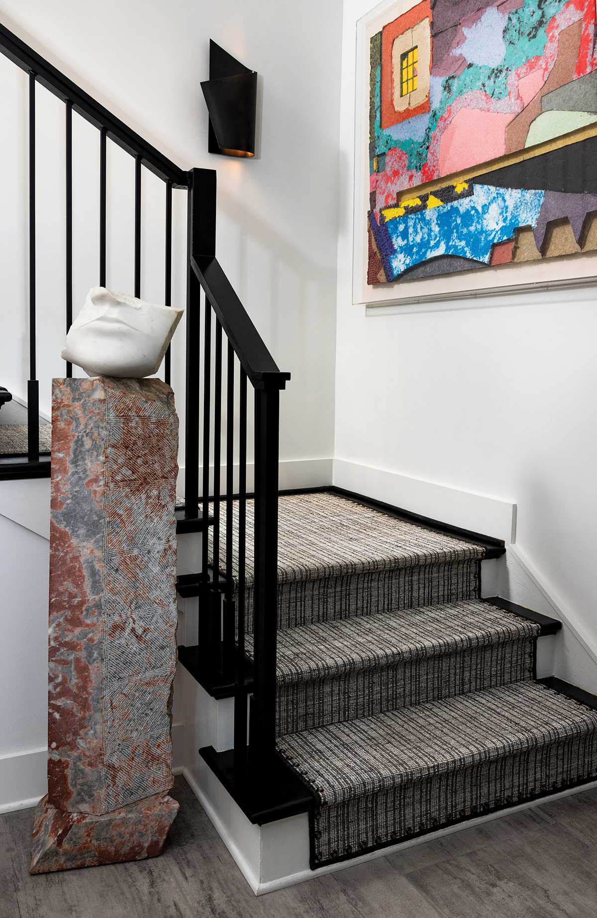 MacNeill added a nailhead trim to the Eatmans Carpet runner on the stairwell (top right). “I love the brass tack, it feels old-timey and European,” says the homeowner. For the primary bath (top left), MacNeill designed a vanity with a built-in makeup counter. They laid two different tiles to create the pattern on the floor. “We liked repeating the idea of the rectangles and squares from the wallpaper in the bedroom,” he says. The black cabinetry and steel on the shower door further draw out the pattern. An antique secretary in the guest room shows a collection of shells and other treasures.