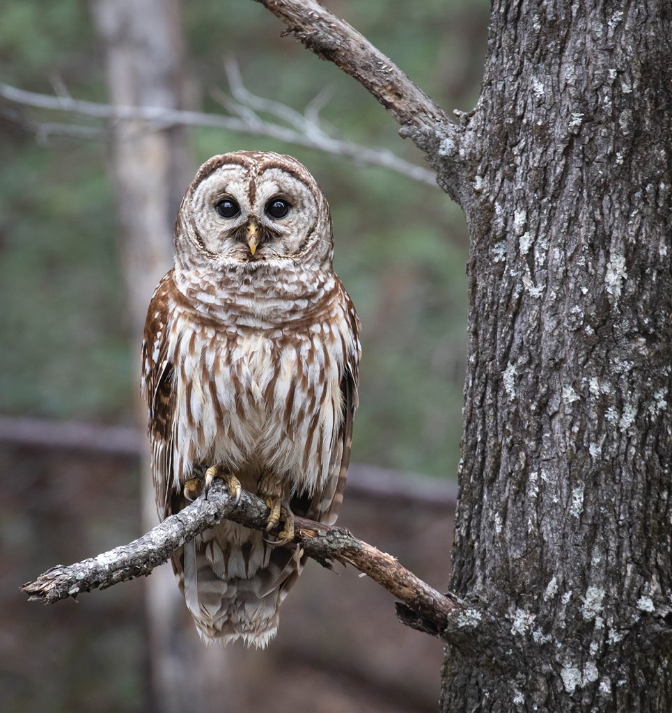 Barred owls are larger than screech owls, reaching total lengths of about 18 to 20 inches, with wingspans up to 40 inches. Named for the barred pattern of their feathers, this is probably our most familiar owl due to their endearing call, which sounds like “Who cooks for you, who cooks for you all?” I hear that call frequently both in the day and night, as barred owls hunt more in daytime than many other species. They prefer swamps or forests near water, but are equally at home in neighborhoods with adequate tree cover. My most memorable moments with this species have been in the swamps along the Roanoke River while canoe camping on the platforms maintained by Roanoke River Partners.
