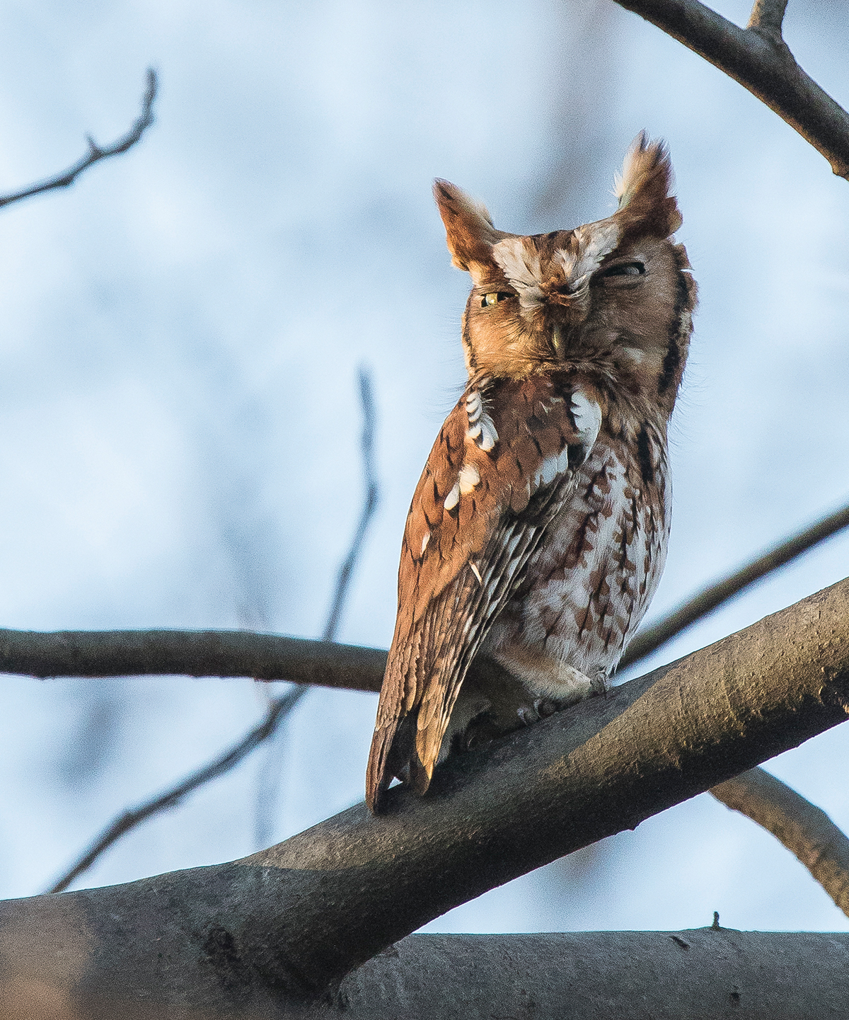 I have had good luck elsewhere, especially in eastern North Carolina. At Pocosin Lakes National Wildlife Refuge, I often see them poking their heads out of wood duck boxes, usually in winter — eastern screech owls seem to enjoy soaking up the last rays of sun on a winter afternoon. I have also found them sitting at the edge of a hole in a hollow tree. They often will slide deeper into the hole if they sense your presence.