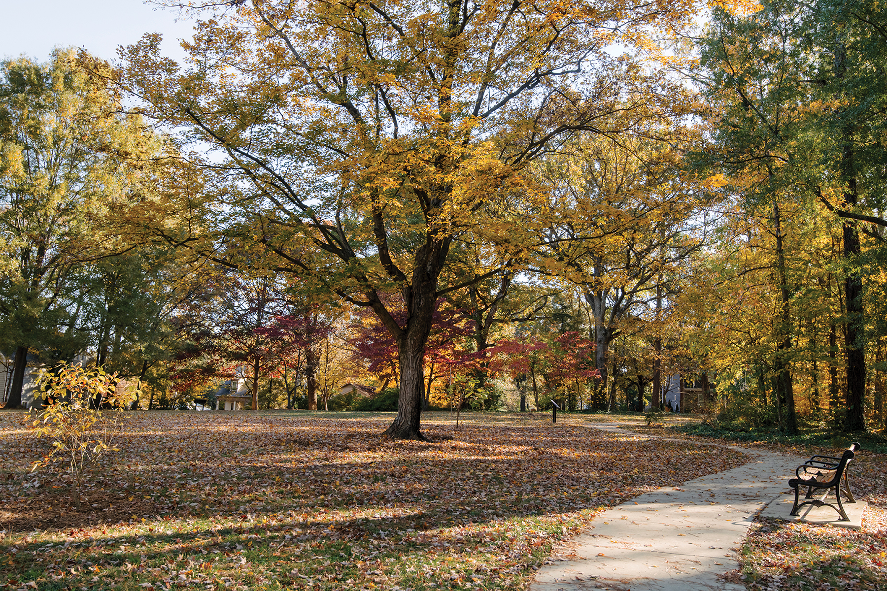 The planning process sparked debate over how best to tell Latta’s story, but over time, two priorities emerged: preserve the history of the land and preserve its serenity. On the 2-acre site, visitors today can trace the Latta House footprint in granite. Six interpretive signs, developed with input from Neuwirth and local historians, highlight artifacts like family photos, census records and findings from archaeological digs, including slate and writing tools, cutlery and coins. Plans for a second phase include an interpretive pavilion to explore the university’s story more deeply.