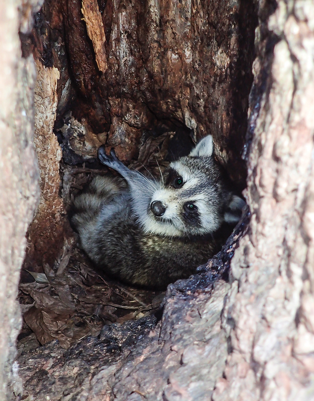 Early one summer, I was out in the yard and heard some squealing coming from that direction. I walked over and found two very tiny raccoons inside the hollow crevice of the tree. It turned out that the mother raccoon was moving her young to another den site down the slope and was carrying them one at a time — and the ones waiting their turn were not happy being left alone. This is typical behavior if the original den is disturbed or if she wants to get them to a den site closer to the ground as they start to mature and explore. I grabbed a couple of photos of the young and then scurried back to the house to let her complete her moves.