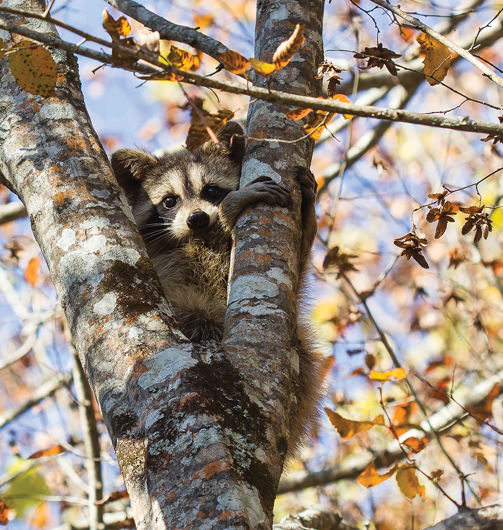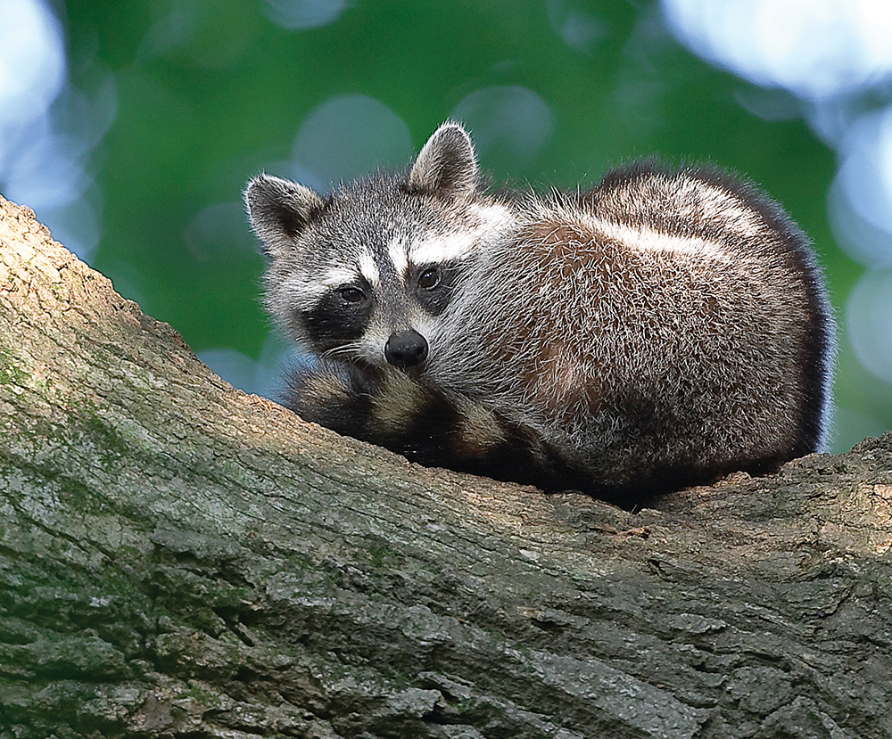 Raccoons are certainly one of the most easily recognized wild mammals. Distinguishing features include brownish-gray fur, a black mask across their face and a ringed tail. They weigh anywhere from 10 to 25 pounds as adults. Their longer hind legs give them a noticeable hunched-over appearance when walking. Raccoons are widespread in our state and occur in both wild lands and urban areas. You may hear them at night making a variety of sounds, including hisses, screams and barks. These so-called masked bandits are intelligent and opportunistic creatures, to be sure, and they have extremely dexterous front paws similar to small hands. They use those long “fingers” to grasp and manipulate their food, and they can even open containers and unlock latches.