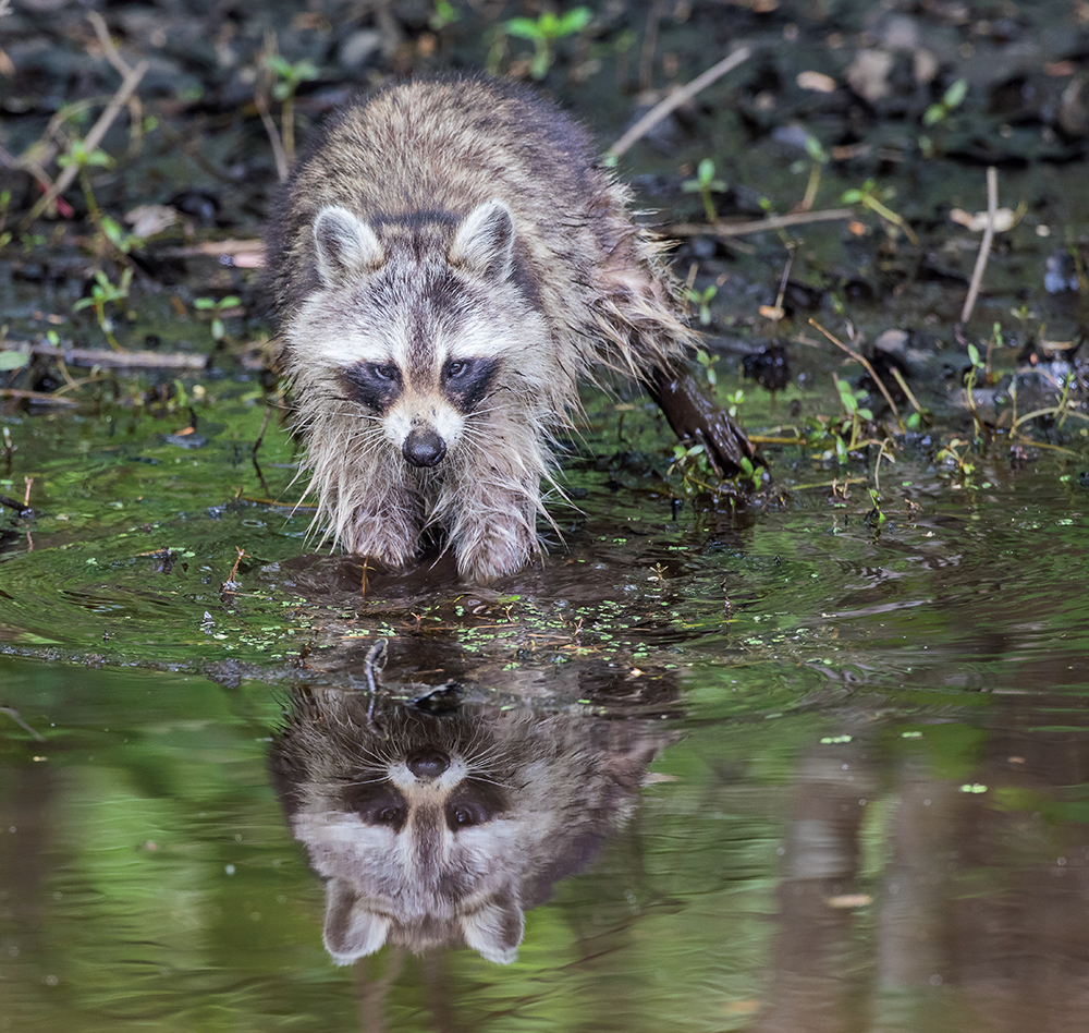 Raccoons frequent the edges of creeks and ponds searching for prey such as frogs, crayfish or other invertebrates. They also eat a lot of plant materials, especially fruits. Many people think that raccoons wash their food before eating, as you may see what looks like them rubbing their paws together underwater as they forage. But studies have shown that the bare skin on their front paws is extremely sensitive to touch and that being wet actually increases that nerve sensitivity, enabling a raccoon to better distinguish food items even in darkness.