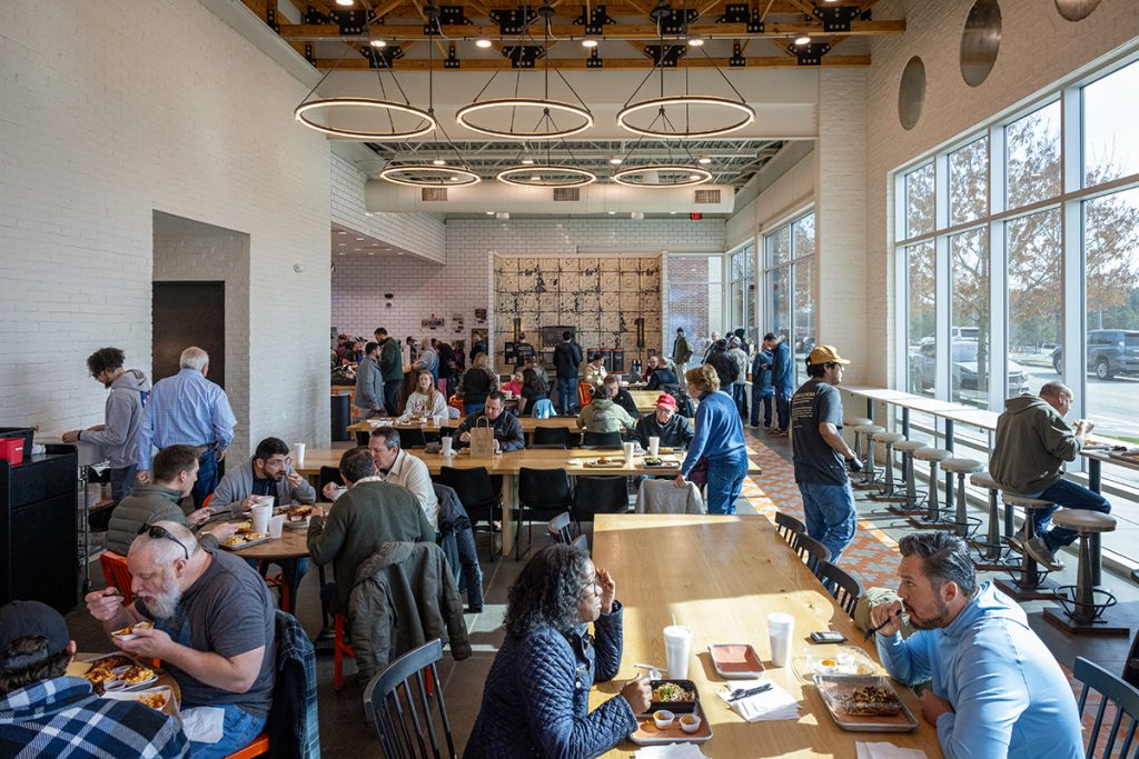 The build took almost two years as they navigated permits and approvals for a wood-fired restaurant. The vision included a bright and airy space inside with a clear navigation to the counter to order food; outside, a covered patio and open-air lawn provided plenty of space for picnic tables.