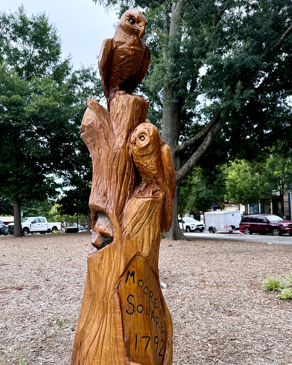 It’s a little thrill to see as you’re walking through Moore Square: a pair of eyes peeking out from a hollow of a tree, a hawk and an owl nearby. They’re close enough to touch but unafraid of visitors — mainly because they’re carved out of wood.
