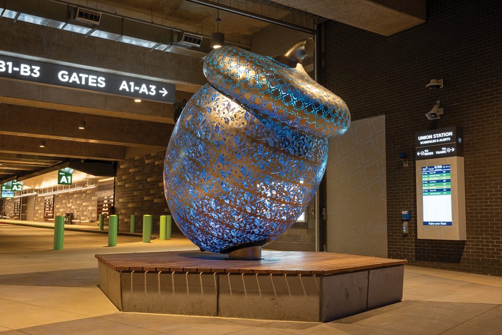 Commissioned by GoTriangle, a giant, stainless-steel installation designed by Creative Machines is now up at the Rue Bus Station an an homage to the City of Oaks delighting tourists and locals alike. Check it out here.