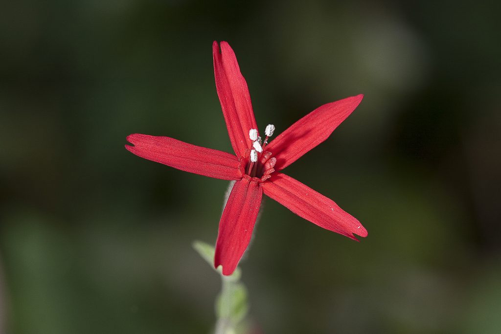 The Fire pink is a member of the pink or carnation family of flowers, despite the fact that its flowers are fire engine red (which perhaps explains its common name). It is a poor competitor, so you often see it isolated or in small clumps in areas where there is sparse vegetation. The five petals are distinctively notched at their tips. The whorled sepals and stems are adorned with minute sticky hairs. This may be an adaptation to prevent crawling insects like ants from stealing the nectar. Once flowering is complete, the equally sticky seed pods droop down, releasing the seeds onto the ground below.