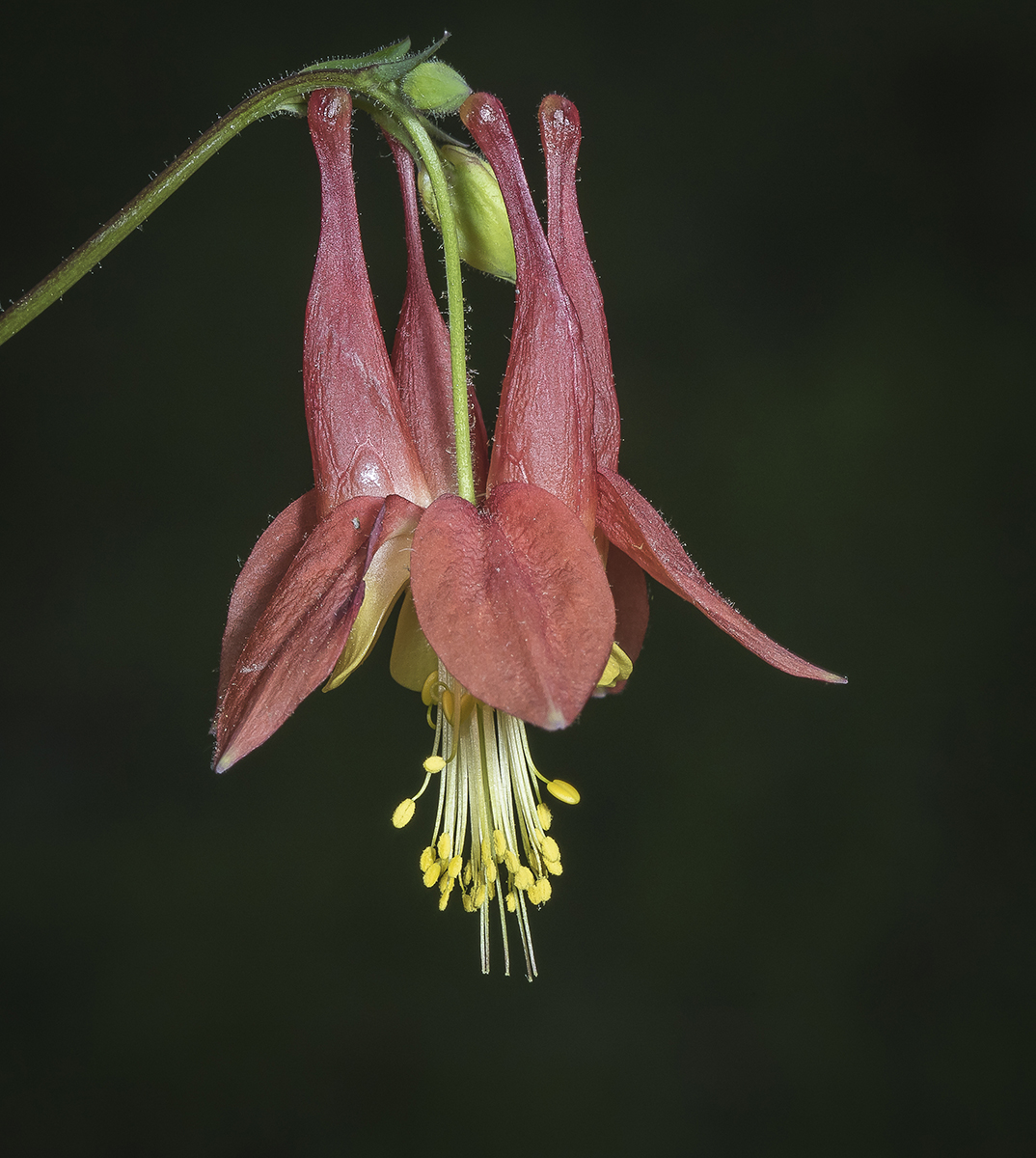 Wild columbine is one of the early red bloomers in our yard. Though more common in habitats in the mountains, it does very well in the Piedmont. It blooms in spring when hummingbirds return from their wintering grounds. The flower appears to be upside down, with its parts hanging out of the bottom, but the nectar is in the swollen tips of its five long upright spurs. This requires something with a long tongue to reach it — like hummingbirds. That said, the flowers are said to be primarily self- pollinated.