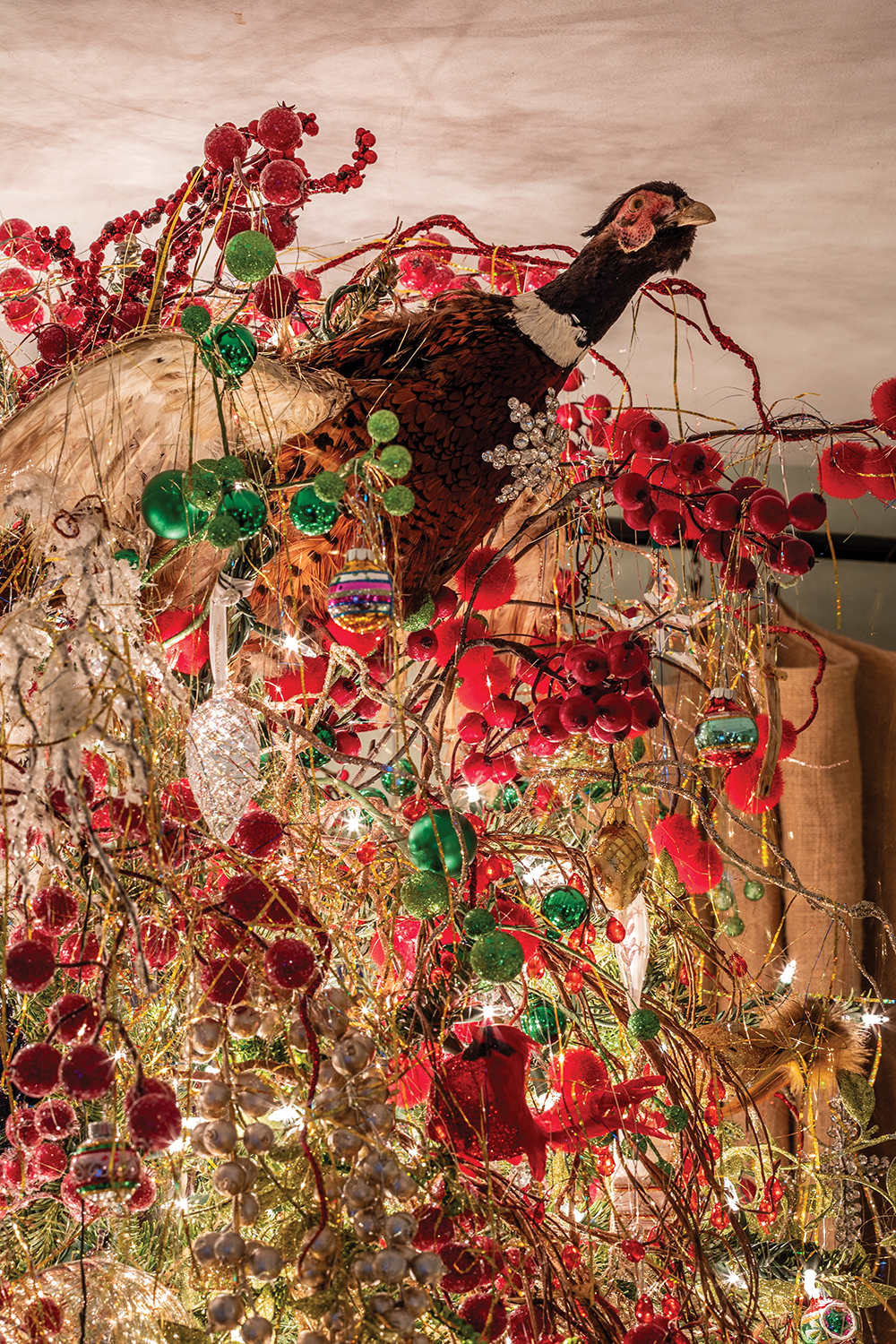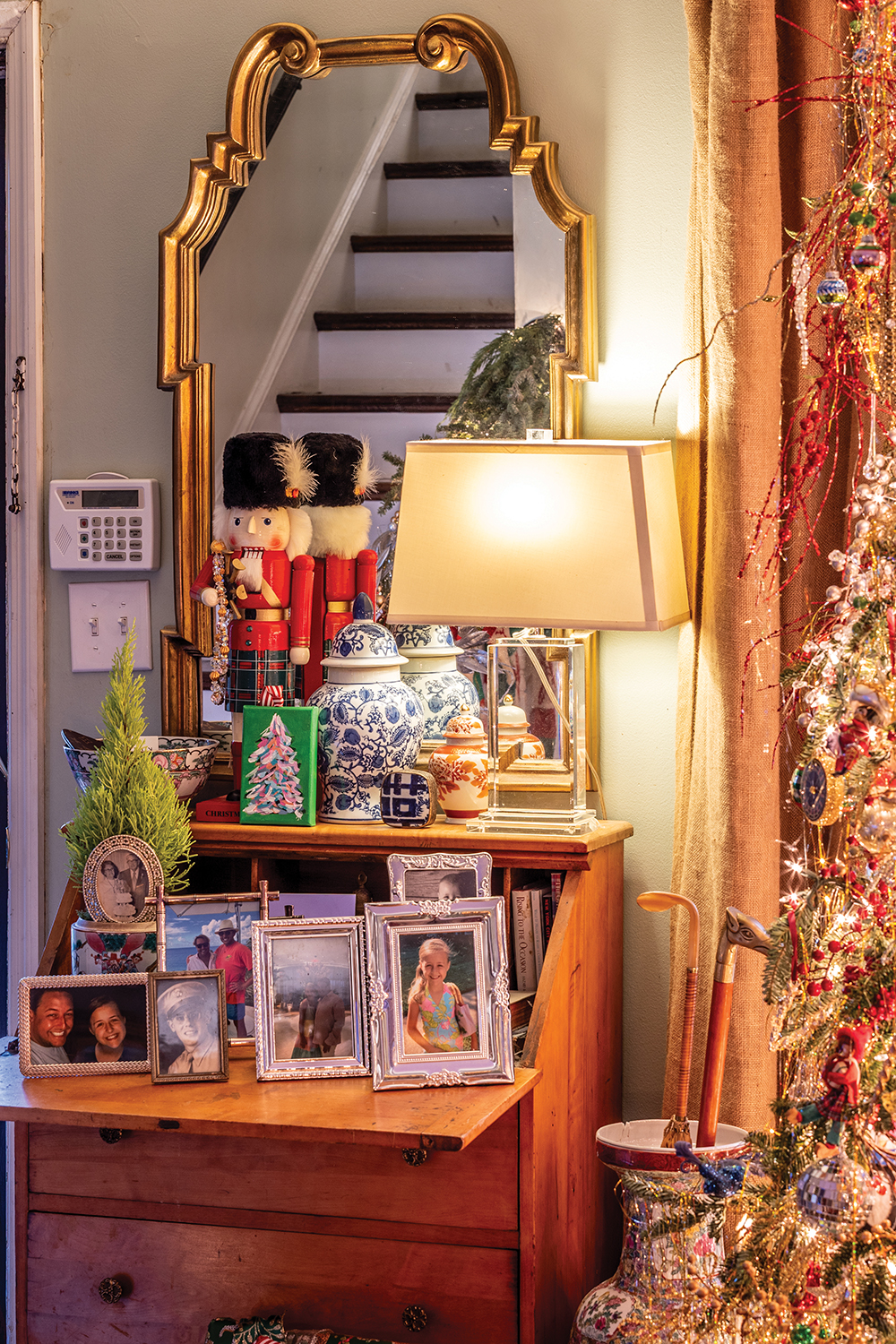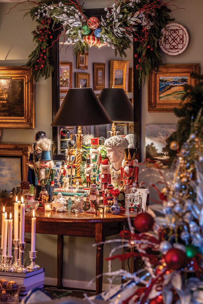A pheasant peeks from the top of the tree, one of many in the home. An antique table displays a collection of nutcrackers that Overby has found over time. Above the mirror is a garland with a mix of natural greens and glittering accents.