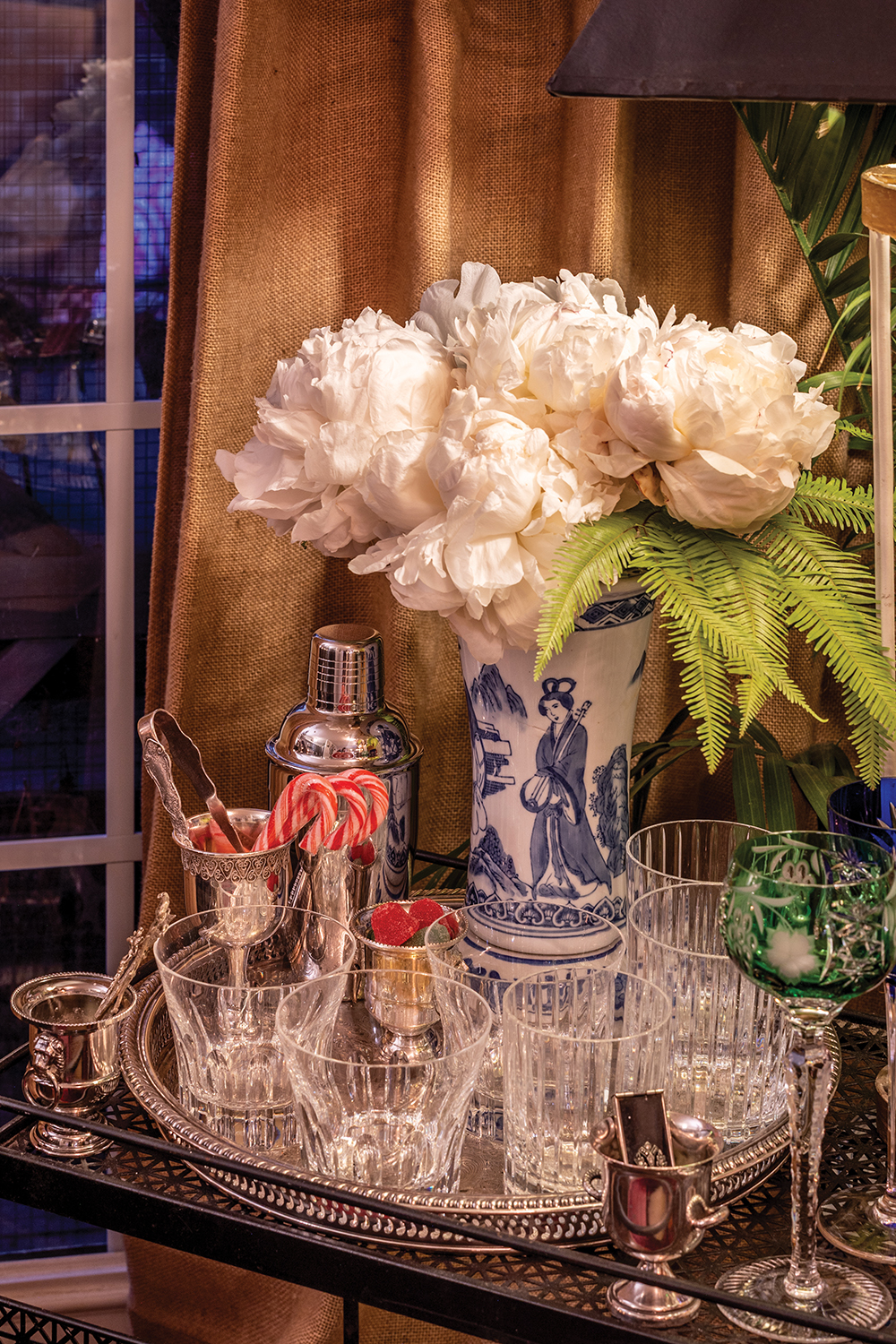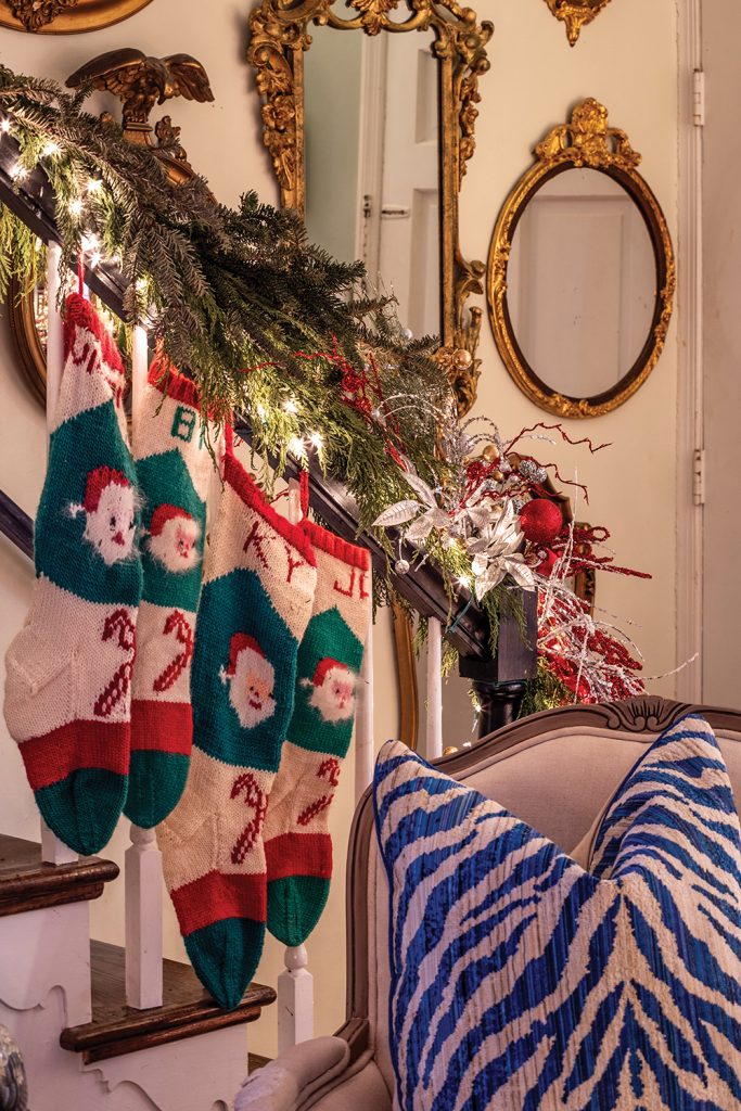 In Overby and Demeritt’s home, no corner is left untouched during the holidays. Vintage knitted stockings traverse the stairs and sparkling, decorative greenery tops the bannisters inside and out. Candy canes peek out from a silver goblet at the bar and from a chinoiserie vase in the kitchen. Blooms abound, and the couple are big believers in candlelight everywhere. They source far and wide for decor: from consignment stores to flea markets, they love the thrill of the hunt and are not afraid to dig (some of their artwork is salvaged from the actual dump).