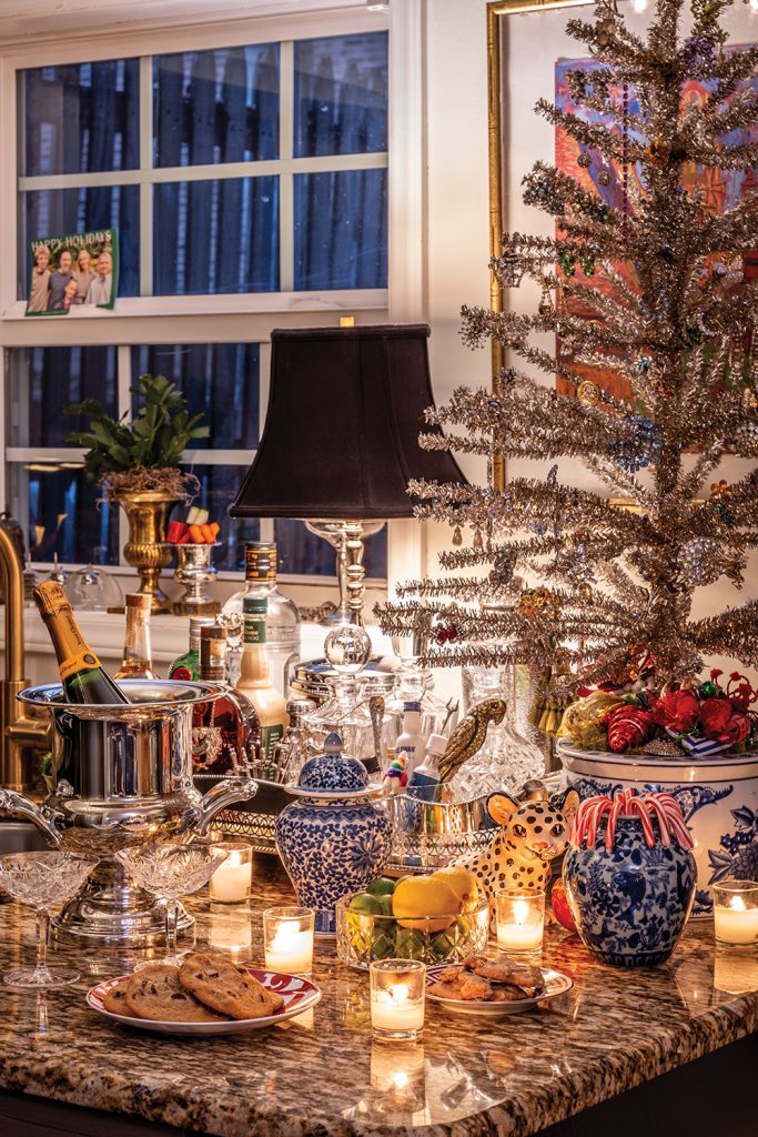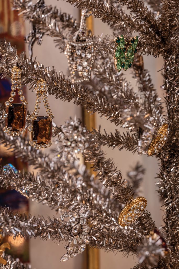 A showstopper in their holiday home is the tinsel tree set out in a chinoiserie bowl on the countertop. Adorned with antique jewelry instead of ornaments, the tree’s branches sparkle with estate sale earrings and stones — including that diamond crescent brooch. “The more tinsel the better,” Overby says of this small tree, but also of the large one he decorates each year, which is hung with its own shimmering strips. “Tinsel on a tree is the perfect final touch.”
