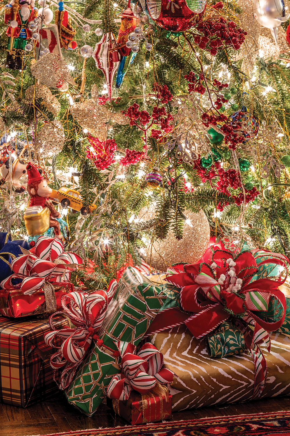 The presents under the tree are as much a part of the decor as the ornaments. Overby enjoys wrapping boxes with exuberant bows in a tight color palette to complement the other holiday decorations.