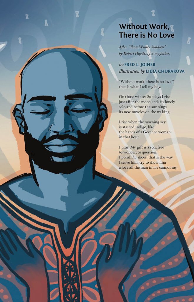 Fred L. Joiner is a poet and curator in Carrboro. His work has been published in various journals, anthologies and art catalogs. Joiner has presented his work nationally and internationally, served as Poet Laureate of Carrboro and was awarded an Academy of American Poets Laureate Fellowship in 2019. His debut collection, The Mirror in Our Music (Birds LLC), is forthcoming. About his poem, he says: “This is a persona poem in my father’s voice. It is me thinking about how he expresses his love in concrete, yet often non-verbal ways. I revisited this poem when I became a father and thought about the rituals I build with my children. I’m particularly proud of it because it opened another door in the love my father and I share.”