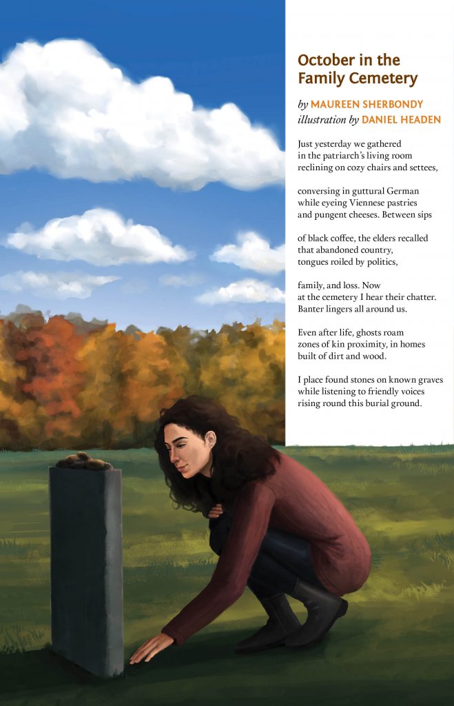 Daniel Headen is a freelance illustrator in the Triangle who concentrates in portraiture and cover art as a means to be a better visual communicator not just for himself, but for others as well. “Maureen’s ‘October in the Family Cemetery’ is such a touching poem, and what a pleasure it was to illustrate around her immersive writing.”