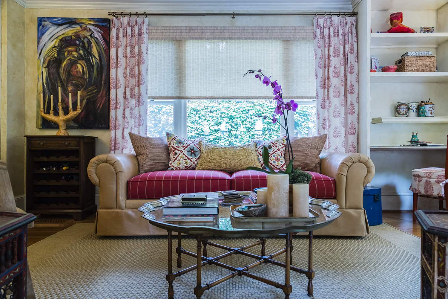 In the living room of the 1925 Spanish Colonial, plaster walls and crown moulding frame a generous space filled with a mix of vintage furniture and fine art.